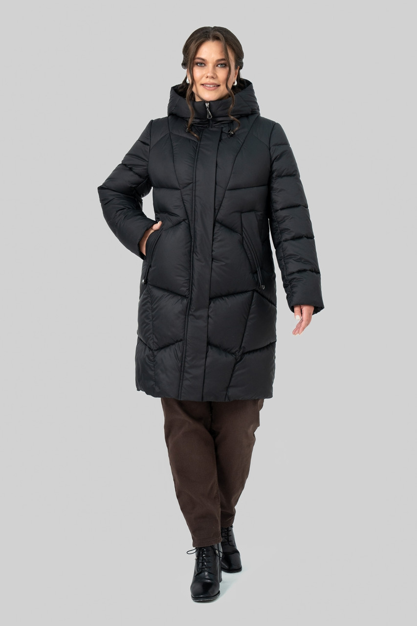 Зимове пальто-пуховик для холодної погоди. Виконане з плащової тканини з утеплювачем біопух 220 г/м², який зберігає тепло при температурі до -24 °C. Прямий силует, втачні двошовні рукави з трикотажними манжетами всередині. Кишені з фігурною листочкою на прихованій кнопці з декоративним шнурком. Капюшон вшивний, регулюється по висоті завдяки шнурам із фіксаторами. Основна застібка — блискавка з планкою на кнопках. Підкладка — нейлон.